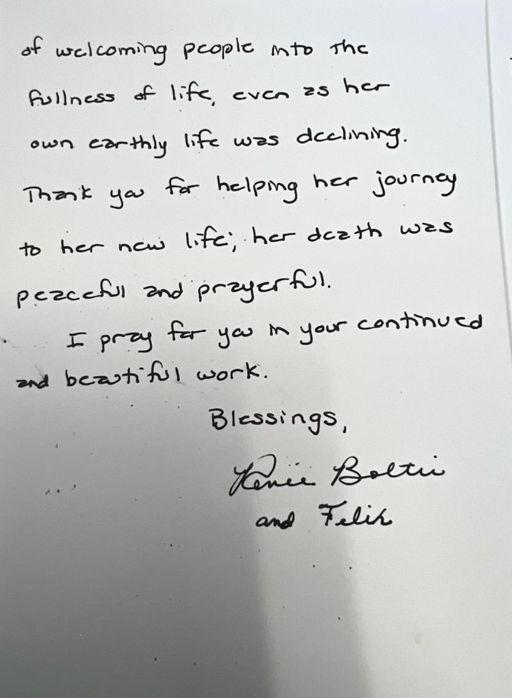 “There are few words to express the depth of gratitude we all have for each of you, individually, and for all of you, collectively. The care and compassion you offered my dear mother, Yvonne is beyond compare. For those of you who spent more time with her I know you formed an indelible bond, in your own way; you made her laugh, you gave her comfort, you cheered her on. Believe me I am aware that you grieve right alongside us. My mom had a way of welcoming people into the fullness of life, even as her own earthly life was declining. Thank you for helping her journey to her new life; her death was peaceful and prayerful. I pray for you in your continued and beautiful work.”